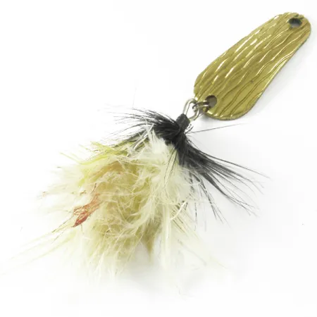 S hmotností 1/4 oz (8 g) odrážejí klasické proporce této plandavky praktickou designovou filozofii, díky níž se katalog George Leonarda Hertera stal nezbytností pro sportovní rybáře poloviny minulého století. Pozlacení vykazuje na konvexní straně vlnitou, tepanou texturu, zatímco vnitřní povrch je vyleštěn do hladka a nese zřetelnou ražbu „HERTER’S HUDSON BAY SPOON“. Nástraha o délce 1 1/2" (4 cm) je osazena trojháčkem s peřím, který kombinuje bílá a černá vlákna prodlužující siluetu nástrahy. Tento konkrétní exemplář, identifikovaný kódem produktu 3493, byl vyroben v Japonsku v éře, kdy společnost Herter’s odebírala robustní komponenty ze zámoří, aby uspokojila nároky amerických rybářů. Kov vykazuje mírné opotřebení odpovídající stáří, což mu vynáší solidní hodnocení stavu 4/5, přesto zůstává čistým a funkčním historickým kouskem. Nahazování této lehké plandavky bylo osvědčenou technikou pro lov pstruhů a okounovitých ryb, spoléhající na záblesky zlatého povrchu a jemnou živoucí kvalitu zdobeného háčku.