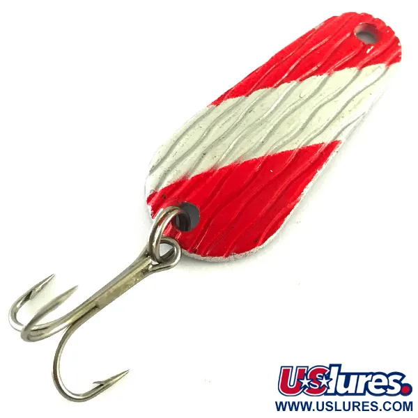 Tento 4cm (1 1/2") kovový korpus s unikátním vlnitým vzorem na lícové straně je vyveden ve výrazném diagonálním červeno-bílém pruhovaném vzoru na niklovém základě. Tento konkrétní exemplář s produktovým kódem 6261 váží 7 g (1/4 oz) a představuje klasický profil přívlačových nástrah z poloviny minulého století. Na zadní straně plandavky je na leštěném niklu jasně čitelná ražba „HERTER'S HUDSON BAY SPOON“ spolu s označením původu „JAPAN“. Osazení je ve výjimečně zachovalém stavu, zahrnuje pevný kroužek a ostrý trojháček. S hodnocením stavu 5/5 je nátěr této plandavky sytý a kov vykazuje jasný, čistý odlesk. Texturovaný povrch je funkčním designovým prvkem určeným k zachycení a odrážení světla z mnoha úhlů během plynulého přitahování.