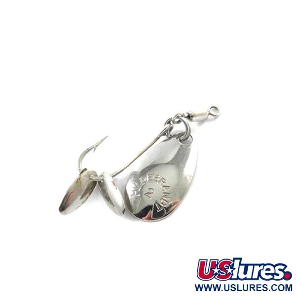 Poniklování poskytuje čistý, reflexní povrch na 2,5 cm (1") rámu této klasické rotačky. S jasně vyraženou značkou „HILDEBRANDT 2“ na hlavním listu je tento výtvor Yakima Bait rozpoznatelným kouskem pro každého nadšence ultra-lightu. Tento exemplář s produktovým kódem 1819 váží jemných 1,4 g (3/64 oz) a je vybaven jednoháčkem. Unikátní doplnění o dva menší sonické listy namontované přímo na ramínku háčku dodává sestavě výraznou mechanickou vrstvu. V horní části je integrovaný obratlík, který pomáhá omezit kroucení vlasce. Stav 4/5, niklové povrchy zůstávají lesklé a ražba je ostrá, s minimálními stopami stáří na kovu.