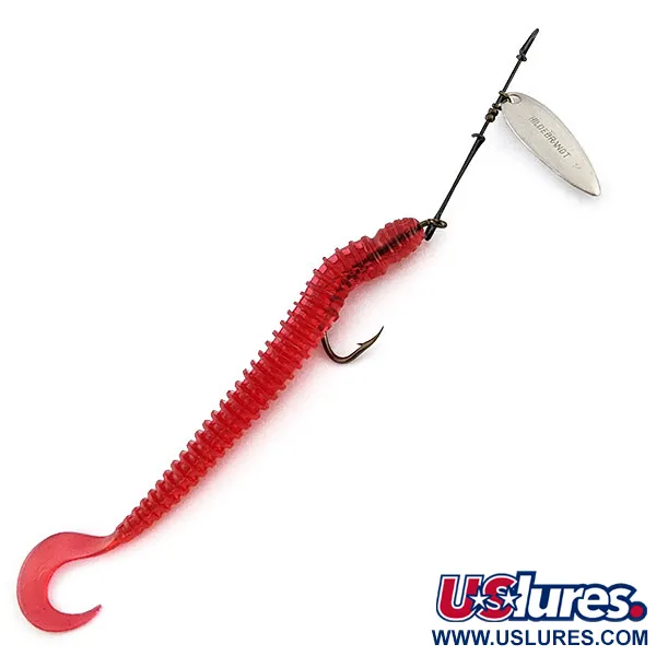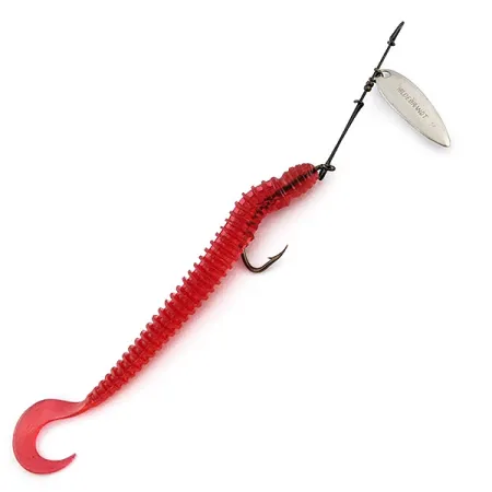 Klasický niklovaný vrbový list s jasně vyraženým názvem Hildebrandt slouží jako hlavní lákadlo této sestavy s kódem 20404. Nástraha o hmotnosti 4,5 g kombinuje tradiční rotační ramínko s průsvitným tělem z měkkého červeného plastu. Tento 15cm žebrovaný twister je nastražen na jednoháčku a poskytuje výrazný profil pro nahazování v rozmanitých podmínkách. Vyrobeno v USA společností Hildebrandt Spinners; hardware se vyznačuje precizním vinutím drátu a vysokou kvalitou povrchové úpravy listu. Tento kus je v perfektním stavu (5/5), přičemž niklování čistě odráží světlo a červený plast si uchovává svou původní poddajnost. Háček zůstává ostrý a je pevně usazen v žebrovaných segmentech těla nástrahy.