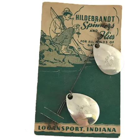 Poniklované listy ve tvaru slzy, ražené ikonickou značkou „HILDEBRANDT 3“, vyzdvihují funkční řemeslné zpracování této historické bižuterie. Tato konfigurace s dvojitou rotačkou o hmotnosti 3/32oz (3g) zůstává upevněna na své původní ilustrované prodejní kartě, která uvádí původ v Logansportu v Indianě. Zadní strana obalu identifikuje tento model jako „originální č. C1“ HILDEBRANDT SPINNER (No. C Idaho Spinner), speciálně navržený pro lov s tradičními muškami pro všechny sportovní ryby. Exemplář katalogizovaný pod produktovým kódem 8519 se vyznačuje dvěma jasnými listy na čistém drátěném dříku. Povrchová úprava kovových součástí byla výjimečně dobře zachována a odráží světlo stejně jako před desetiletími v USA. Tento kus ukazuje přístup k vícečepelovým nástrahám z počátku 20. století, využívající jednoduchá mechanická spojení, která umožňují listům volně rotovat kolem centrální osy. Exemplář je ve stavu 5/5, zachovává si svůj původní lesk a strukturální integritu, zatímco podkladová karta slouží jako historický záznam kořenů značky na Středozápadě.