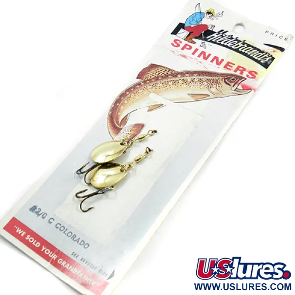 Pozlacený povrch těchto dvou malých rotačních listů typu Colorado skvěle odráží světlo. Listy jsou stále upevněny na své původní tovární kartě Hildebrandt. S hmotností 1,4 g (3/64 oz) představují tyto třpytky klasický americký design, který firma proslavila sloganem „Prodávali jsme už vašemu dědečkovi“. Na listech je vyraženo jméno Hildebrandt a označení velikosti, což zaručuje autentičnost pro sběratele vintage náčiní. Ke každému zlatému listu je připojen malý, ostrý trojháček upevněný pomocí kvalitních komponentů pro lehkou přívlač na pstruhy nebo okouny. Tato sada s produktovým kódem 1882 zůstala nepoužitá v původním balení, i když karta nese mírné stopy stáří. Vyrobeno v USA, mosazné obratlíky a kroužky zůstávají pevné a funkční. Kapkovitý tvar listu Colorado je tradiční konstrukce zajišťující vztlak při pomalém vedení v proudu i na stojaté vodě.