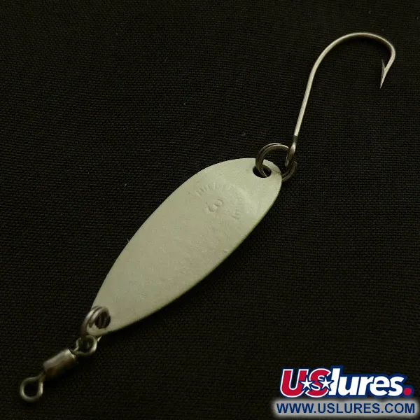 Tato plandavka ve tvaru kapky o hmotnosti 1,9 g (1/16 oz) představuje klasický ultra-light model z USA. Povrchová úprava tohoto konkrétního modelu Little Shaver 3 s kódem produktu 23507 kombinuje perleťovou a zelenou barvu – jedna strana má jemný bílý perleťový nádech, zatímco druhá je vyvedena ve výrazné neonově zelené. Měří 3,5 cm (1 1/2") na délku a je osazena jednoháčkem s protihroty na raménku pro lepší fixaci nástrahy, který je připevněn přes pevný kroužek a doplněn malým obratlíkem v přední části. Zadní strana plandavky nese jasně vyražené jméno výrobce Hildebrandt a číslo velikosti 3. Nástraha je ve stavu 5/5, má čistý, lesklý povrch kovu a ostré, původní komponenty. Je navržena pro přesné nahazování v potocích nebo rybnících, přičemž osazení jednoháčkem je ideální pro lov pstruhů a menších ryb s minimálním rizikem uváznutí.