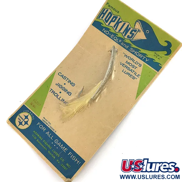 S váhou 1/4 oz (7 g) se tento exemplář vyznačuje charakteristickou tepanou stříbrnou povrchovou úpravou, která je synonymem pro značku Hopkins. Tato 2 1/4" (6 cm) plandavka je uchována na původní vintage kartě s produktovým kódem 7694. Strukturovaný povrch je navržen tak, aby odrážel světlo z mnoha úhlů, což je charakteristickým znakem řady „Famous Hopkins“, historicky vyráběné v Norfolku ve Virginii. Tento konkrétní model 238 obsahuje jednoháček osazený světlým bucktailovým přívěskem a je v nepoužitém stavu (6). Jak je uvedeno na obalu „No-EQL and Shorty“, tyto nástrahy byly navrženy pro přívlač, jigging a trolling při lovu všech dravých ryb. Karta vyzdvihuje provedení z nerezové oceli a samotné kovové tělo má u upevňovacího bodu vyražený název značky.