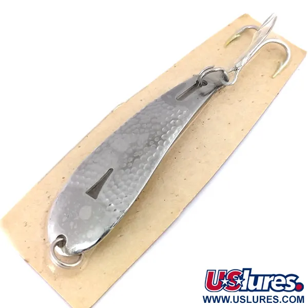 Tato klasická nástraha s výrazným povrchem v tlučeném niklu odráží světlo celým svým kovaným tělem z masivní nerezové oceli. R. L. Hopkins je začal vyrábět v roce 1949, aby vyřešil potřebu nástrahy pro daleké nahazování, která by odolala korozivnímu prostředí mořského rybolovu a opotřebení. Je vybavena originálním trojháčkem Mustad upevněným nerezovým kroužkem, což zajišťuje odolnost při lovu větších druhů ryb. Nález nástrahy Hopkins Hammered Spoon (kód produktu: 10618) v nepoužitém stavu je vrcholem pro každého sběratele, zejména proto, že zůstává připevněna k původní instruktážní kartě. Tento exemplář měří 2 1/4" (6 cm) a váží 1/4 oz (7 g). Jak je uvedeno na dobovém balení, design je vhodný pro přívlač, jigging nebo lov na dírkách, určený k propadávání ke dnu nebo k práci v různých hloubkách. Tyto nástrahy zůstávají hrdým příkladem výroby v USA.