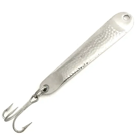 Tato plandavka Hopkins No=Eql hammerd s úctyhodnou hmotností 2 oz (60 g) a plochým profilem nezapře svůj původ v těžkém surfcastingu. Tělo o délce 4 1/4" (10,5 cm) má hluboce strukturovaný povrch z tepaného niklu, který je navržen tak, aby zachycoval a rozptyloval světlo ve vodním sloupci a napodoboval tak prchající nástražní rybku. Na boku je jasně vyražen nápis „HOPKINS NO=EQL 3 1/2“ spolu se zemí původu USA, což svědčí o dlouholeté výrobní tradici značky ve Státech. Tento konkrétní kus s kódem 6551 je ve stavu 5/5 a udržuje si brilantní lesk na svém tepaném povrchu bez jakýchkoli známek koroze. Výbavu tvoří robustní trojháček zajištěný silným kroužkem, konstruovaný tak, aby odolal slané vodě a útokům velkých dravců. Pro rybáře lovící mořčáky nebo lufary je aerodynamický tvar této masivní kovové nástrahy zásadní pro daleké hody i v silném protivětru. Otvor v hlavové části zajišťuje spolehlivé spojení s obratlíkem nebo silným návazcem.