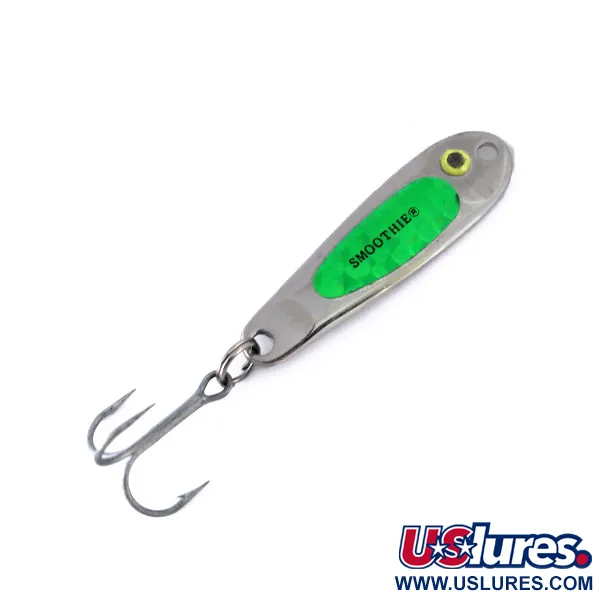 Luminiscence určuje atraktivitu zelené vložky na této poniklované třpytce, která zářivě svítí za slabého osvětlení nebo v UV podmínkách. Hopkins Smoothie (kód produktu 10048), kovaný v USA, je vybaven texturovaným panelem „Glow“, který přechází z jasně zelené za denního světla na strašidelnou neonovou v hloubkách. Hutné tělo o délce 6 cm a hmotnosti 21 g je konstruováno pro daleké náhozy a vertikální přívlač. Malé oko se žlutým okrajem je umístěno blízko očka na vlasec a poskytuje kontrastní bod proti leštěnému kovu. Tento exemplář je zachován ve stavu 5/5, s původní tovární povrchovou úpravou a ostrými trojháčky. Značka „SMOOTHIE®“ je jasně vyražena do fluorescenční vložky.