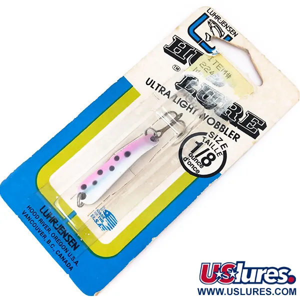 Poniklování poskytuje reflexní základ této 4g (1/8oz) kovové plandavce, která je navržena tak, aby prorazila povrchové proudy a dosáhla k rybám v hloubce. Tato Hus-lure pod kódem 10383 se vyznačuje vzorem Pstruh s jemným růžovo-fialovým nádechem a výraznými černými tečkami na stříbrném těle. Tělo o délce 4cm (1 1/2") je tvarováno pro daleké nahazování a využívá úzký profil, který stabilně pracuje v proudech i na stojaté vodě. Tento konkrétní kus je nepoužitý, zachovaný v původním modro-žlutém kartonovém obalu z továrny Luhr Jensen v Hood River v Oregonu. Zůstává osazen originálním továrním příslušenstvím, včetně malého kroužku a ostrého trojháčku s bronzovou povrchovou úpravou. Každý detail, od ostrého raženého loga až po neporušený blistr, odráží kvalitu amerického rybářského vybavení z této éry.