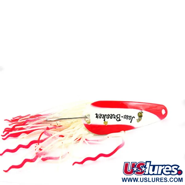 Hmotnost 1/2oz (15,5g) dodává této plandavce Northland potřebnou váhu pro přesné nahazování do husté vegetace a leknínů. Klasický červeno-bílý povrch je zřetelně opatřen názvem „Jaw-Breaker“ v osobitém vintage písmu, které identifikuje tento exemplář z produktové řady 1138. Kovové tělo o délce 5,5cm (2 1/4") je doplněno bohatými třásněmi v bílé a červené barvě, což je design speciálně navržený pro lov bez váznutí v těžkém krytu. Tato nástraha, vyrobená v USA, je vybavena robustním jednoháčkem integrovaným do ochrany proti vázkám. Celkový stav je úctyhodných 4/5, vykazuje pouze drobné známky času stráveného v krabičce, přičemž celistvost laku i hardwaru zůstala zachována. Vícevláknové třásně zůstávají poddajné, připravené pro náročný lov štik nebo okounů v místech, kde by běžné nástrahy uvízly.