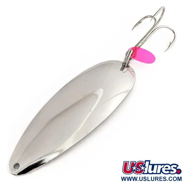 Klasická hmotnost 1/2 oz (14 g) činí z tohoto exempláře všestrannou volbu pro přívlač nebo lehký trolling v různých hloubkách. Povrchová úprava z leštěného niklu poskytuje vysoce kontrastní odlesky, což je charakteristický znak starších nástrah Johnson Sprite vyráběných v USA před přesunem produkce do zahraničí. Tato nástraha, označená kódem produktu 11256, představuje éru domácího řemesla, kterou sběratelé oceňují pro kvalitu materiálu. Na zadní straně je do kovu jasně vyražen název 'Johnson Sprite', což zajišťuje autentické označení pro jakoukoli sbírku vintage rybářského náčiní. Na pojistném kroužku vedle trojháčku je namontováno malé, zářivě červené plastové dráždidlo, které vytváří výrazný vizuální bod na stříbrném těle. Plandavka o délce 2 3/4" (7 cm) má kapkovitý profil navržený pro stabilní chod. Tato položka je ve vynikajícím stavu, získala hodnocení 5/5 za svůj jasný, zrcadlový povrch a dobře zachovalé původní osazení.