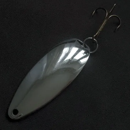 Jasně vyražený název „JOHNSON'S SPRITE“ na vypouklé straně leštěného kovu identifikuje tuto klasickou americkou plandavku. Lesklá niklová povrchová úprava poskytuje vysokou odrazivost a efektivně zrcadlí světlo po celém 5cm (2") těle. S hmotností 10 g (1/3 oz) je profil ve tvaru kapky navržen pro daleké náhozy a plynulé vedení nástrahy. Tento exemplář s produktovým kódem 22365 je osazen zachovalým trojháčkem, který je v zadní části upevněn pomocí spojovacího kroužku. V úzké přední části je vyvrtáno očko pro přímé navázání vlasce nebo připnutí karabinky. Stav povrchu je vynikající, ohodnocený stupněm 5/5, přičemž si zachovává brilantní lesk bez viditelné oxidace nebo poškození pokovení. Tato celokovová plandavka Johnson Sprite, vyrobená v USA, zůstává osvědčenou volbou pro rybáře, kteří se věnují tradiční přívlači na sladkovodních vodách.