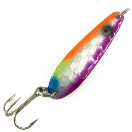 Na měděné zadní straně s texturou včelí plástve je jasně vyražen název „JR STREAK“, který identifikuje tuto klasickou trollingovou plandavku. Přední strana se pyšní zářivým vzorem Rainbow Pearl, přecházejícím z jasně oranžové špičky přes fialovou a limetkovou až po sytě modrou základnu, to vše na strukturovaném stříbrno-bílém středu s výrazným tmavým okem. Tento konkrétní kus s produktovým kódem 4373 měří 5,5 cm (2 1/4") a vykazuje kvalitní řemeslné zpracování očekávané od nástrahy Stinger vyrobené v USA. Měděná zadní strana poskytuje výrazný světelný kontrast k vícebarevné přední části. Výbava zahrnuje pevný trojháček a dvojité kroužky pro bezpečné upevnění. Celkový stav je vynikající 5/5.