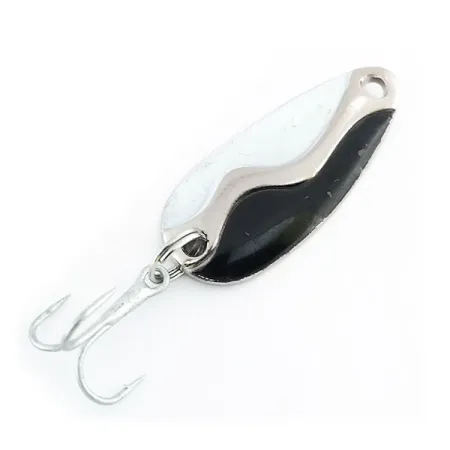 Tato americká plandavka o všestranné hmotnosti 7 g (1/4 oz) se vyznačuje nápadným tříbarevným provedením na své konvexní straně. Povrchová úprava je rozdělena mezi černý a bílý smalt, které odděluje výrazně zakřivená vlnovka z leštěného niklu táhnoucí se po celé délce těla. Tato plandavka od Acme o délce 3,5 cm (1 1/2"), označená kódem 9801, nese na zadní straně jasně vyražené jméno výrobce a model. Vysoce kontrastní vzor Černá / Bílá / Nikl poskytuje výrazný vizuální záblesk při nahazování i trollingu. Co se týče výbavy, zůstává osazena robustním kroužkem a čistým, ostrým trojháčkem. Tento exemplář je ve vynikajícím stavu s hodnocením 5/5, přičemž lak i niklování si zachovávají svůj původní lesk. Vyrobeno v USA, zpracování podtrhuje odolné kovové prvky a kvalitní povrchovou úpravu typickou pro klasické náčiní Acme.
