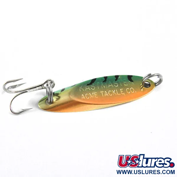 Lakování Fire Tiger na této kovové plandavce o hmotnosti 3,5 g (1/8 oz) zajišťuje vysokou viditelnost v různých vodních podmínkách. S délkou 3,5 cm (1 1/2") je tato Acme Kastmaster, evidovaná pod produktovým kódem 0882, klasickým příkladem rybářského vybavení vyrobeného v USA. Přední strana je vyražena jménem výrobce a vyznačuje se zářivým zeleno-oranžovým přechodem s výraznými černými svislými pruhy, zatímco zadní strana si zachovává čistý, leštěný mosazný povrch. Při její konstrukci byla použita specifická slitina, která zajišťuje přesné vyvážení jak při klesání, tak při navíjení. Součástí vybavení je stříbrný trojhák zajištěný kroužkem, s odpovídajícím kroužkem u hlavy pro snadné připevnění vlasce. Stav této konkrétní nástrahy je hodnocen 5/5, což dokládá neporušenost původního laku a jasnost ražby do kovu. Rybáři po této váhové kategorii často sahají, když potřebují všestranný nástroj pro hlubinné jigování nebo nahazování do silných proudů, kde by lehčí nástrahy mohly mít potíže.
