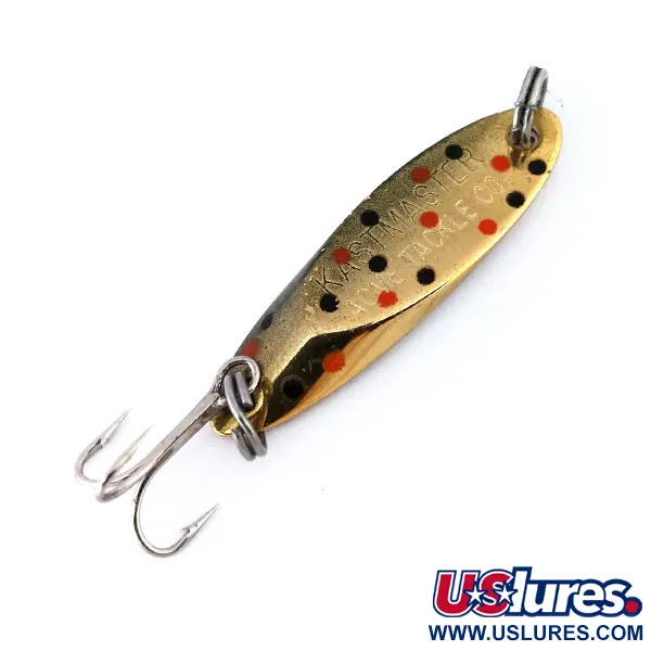 Do těla této 3,5 g (1/8 oz) plandavky jsou jasně vyraženy ikonické značky KASTMASTER a ACME TACKLE CO., které ji identifikují jako klasický kus náčiní vyrobený v USA. Povrchová úprava Golden Trout je obzvláště působivá a vyznačuje se leštěným zlatým povrchem zdobeným střídajícími se řadami černých a červených teček. Tento exemplář měří přesně 3,5 cm (1 1/2") a nese produktový kód 10406. Těžká kovová konstrukce a specifická slitina použitá společností Acme byly navrženy tak, aby zajistily rovnováhu nástrahy jak při propadu, tak při přitahování. Osazení je ve vynikajícím stavu, tvořené stříbrným trojháčkem a robustními kroužky na obou koncích. Ve stavu 5/5 zůstávají reflexní povrch a nátěr pozoruhodně ostré a dobře zachovalé. Tato konkrétní velikost je základem pro rybáře lovící pstruhy nebo okouny, ať už se používá pro daleké nahazování nebo vertikální jigging v hlubší vodě.
