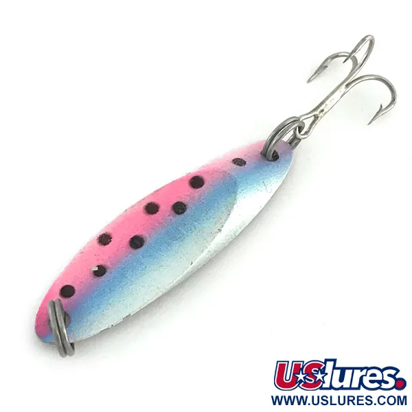 Niklový podklad poskytuje vysoce reflexní základ pro vzor pstruha na této 7g (1/4 oz) plandavce. Originální design Acme, vyrobený v USA pod kódem 9340, spoléhá na specifickou kovovou slitinu, která zajišťuje stabilitu chodu při navíjení i propadu. Vzor pstruha vykazuje zářivé růžové a modré přechody podél horní hrany, doplněné čistými černými tečkami imitujícími potěr. S délkou 4,5 cm (1 3/4 palce) je tento model univerzální volbou pro lov dravců v hluboké vodě nebo silných proudech, kde je vyžadován kompaktní, aerodynamický profil. Povrchová úprava a lak jsou ve špičkovém stavu s hodnocením 5/5. Hardware doplňuje robustní trojháček připevněný pomocí pevných kroužků na obou koncích.