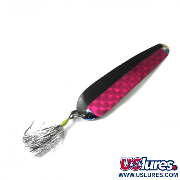 Tato trollingová plandavka s délkou 8 cm (3 1/4") se vyznačuje štíhlým kovovým tělem a výrazným děleným barevným schématem. Model Kausch 14, identifikovaný kódem produktu 0444, má na zadní straně leštěný niklový povrch, zatímco přední strana je rozdělena na sytě černou horní polovinu a zářivě červenou pásku s šupinovým vzorem v dolní části. Tato nástraha vyrobená v USA o hmotnosti 3,7 g (1/8 oz) je vyvážena pro trolling, kde je vyžadován štíhlý, protáhlý profil. Stříbrný střapec z tinselových vláken je k zadnímu kroužku připevněn neonově žlutozeleným ovinu, což dodává záblesk vláken kontrastující s tvrdým reflexním povrchem. Tento konkrétní kus je ve stavu 4/5, přičemž dekorativní šupiny i niklování zůstávají jasné a dobře definované. Upevňovací bod u hlavy tvoří jednoduché ražené očko, což je charakteristické pro přímočarý design výrobce u specializovaného trollingového vybavení.