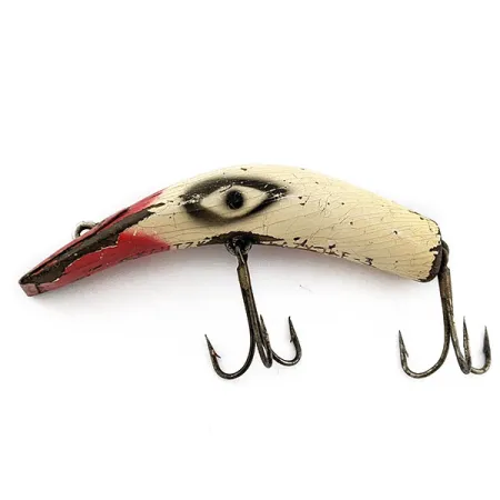 Výrazně prohnuté tělo definuje siluetu tohoto 7cm dřevěného modelu, který je ukázkou amerického řemesla poloviny minulého století. S hmotností 9 g nese Kautzky Lazy Ike 3 produktový kód 20123 a vyznačuje se krémovým tělem doplněným o výrazně červenou přední část a velká malovaná očka typu bullseye. Povrch vykazuje charakteristickou síť jemných prasklinek v laku a značné opotřebení barvy způsobené běžným používáním, což odpovídá hodnocení stavu 3 z 5. Originální tovární značení umístěné uprostřed boku jasně identifikuje původ a číslo modelu. Dva břišní trojháčky vykazují silnou oxidaci a známky stáří, což odráží dlouhou historii této nástrahy vyrobené v Iowě.