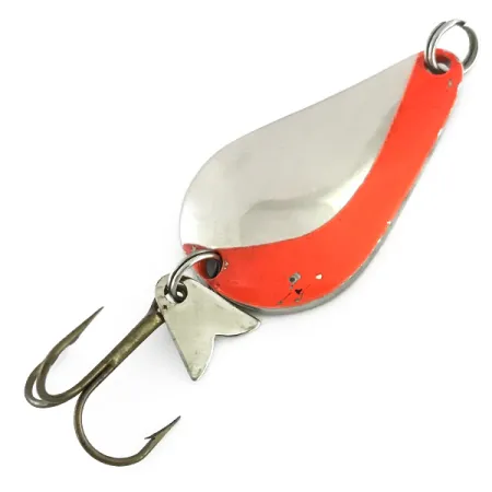 Výrazný stříbrný a oranžovo-červený diagonální vzor zdobí přední stranu této 4,5 cm (1 3/4") plandavky Acme. S hmotností 14 g (1/2 oz) je tato nástraha z masivního kovu navržena pro daleké hody a lov v hlubších vrstvách vody. Na konkávní straně je do kovu hluboce vyražen název „K.O. WOBBLER“, což dokládá výrobní standardy značky Acme pro tento produktový kód 8507. Tento konkrétní kus vykazuje známky běžného opotřebení v podobě drobných oděrek laku a lehkých povrchových značek na leštěném kovu, což odpovídá hodnocení stavu 3,5/5. Osazení zůstalo původní, včetně předního kroužku a unikátního kovového vábitka ve tvaru V upevněného na zadním kroužku spolu s trojháčkem. Samotný trojháček jeví mírné známky stáří, ale zůstává konstrukčně v pořádku.