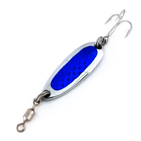 Střed této 3,5 cm (1 1/2") plandavky pokrývá sytě modrá prizmatická fólie, která odráží světlo díky výraznému šupinatému vzoru. Tato plandavka Luhr Jensen Krocodile o hmotnosti 7 g (1/4 oz) je základním prvkem výbavy pro rybáře, kteří hledají kompaktní nástrahu s vynikajícími vlastnostmi pro daleké nahazování. Na zadní straně je vyraženo klasické logo značky Luhr Jensen a název modelu Krocodile. Osazení tohoto kusu, identifikovaného kódem 15647, zahrnuje robustní obratlík v přední části a ostrý trojháček vzadu, přičemž obojí je spojeno pevnými kroužky. Tato konkrétní nástraha nebyla použita a na leštěném niklovém povrchu si zachovává svůj původní tovární lesk. Úzké tělo z masivního plechu je charakteristickým znakem řady Krocodile, navržené pro efektivní lov při přívlači i trollingu.