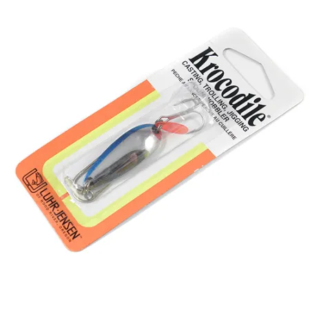 Výrazný modrý pruh se táhne podél okraje této plandavky s niklovou povrchovou úpravou a vytváří ostrý kontrast k leštěnému kovovému tělu. Luhr Jensen vyrobil tento model Krocodile, katalogizovaný pod kódem produktu 2055, pro různá prostředí od horských jezer až po pobřežní mola. S hmotností 1/3 oz (9 g) a délkou 1 1/2" (4 cm) je plandavka konstruována s úzkým, silným profilem, který napomáhá vzdálenosti při nahazování. Je vybavena výrazným červeným plastovým dráždidlem připevněným k zadnímu kroužku hned vedle trojháčku, které slouží jako vizuální spouštěč útoku. Design je určen pro nahazování, trolling nebo jiggování, což odráží dědictví značky z Hood River v Oregonu. Tento exemplář je nepoužitý, stále zapečetěný v původním prodejním blistru, který chránil niklování a celistvost modré barvy. Zadní strana karty poskytuje historický kontext značky a potvrzuje její vhodnost pro různé vodní podmínky.