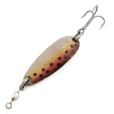 Na leštěné mosazné zadní straně jsou jasně vyraženy značky „LUHR JENSEN“ a „KROCODILE“, které odkazují na historii této 4cm plandavky. Tento konkrétní kus, označený produktovým kódem 22434, představuje detailní povrchovou úpravu Brown Trout s teplým červenooranžovým postranním pruhem a tmavými skvrnami na kovovém povrchu. S hmotností 9 g (1/3 oz) je nástraha vyvážena pro nahazování, trolling nebo techniky vertikálního jiggingu. Výbava se skládá z válečkového obratlíku na předním kroužku a ostrého trojháčku na zadním konci, díky čemuž je připravena k vodě i do sběratelské vitríny. Pokud jde o zachovalost, stav je solidních 4/5, což dokládá čistý povrch odrážející kvalitní výrobu v USA. Tento design je mezi sběrateli vysoce ceněn pro svůj univerzální profil, který si zachovává svou akci, ať už nástrahu vedete pomalu, nebo trollujete při vyšších rychlostech.