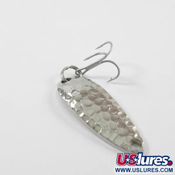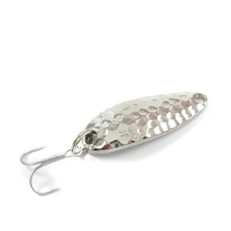 Výrazná hmotnost 1/4oz (7g) soustředěná do 1 1/2" (4cm) těla činí z této Luhr Jensen Krocodile ideální volbu pro lov v hlubokých vodách. Jedna strana nástrahy má texturovaný povrch Hammered Nickel navržený pro odraz světla, zatímco druhá strana je hladce vyleštěná a nese jasně vyraženou značku výrobce „LUHR JENSEN KROCODILE“. Tato plandavka, označená produktovým kódem 2682, je znatelně silnější než běžné nástrahy, což usnadňuje daleké náhozy i v silném větru. Výbavu tvoří robustní kroužek a čistý trojháček, oba ve výborném stavu. Tento vintage exemplář je v kondici 5/5 a zachovává si jasný lesk po celém povrchu. Těžký profil této nástrahy je vhodný zejména pro rybáře, kteří potřebují dostat svou prezentaci rychle ke dnu v tekoucích vodách nebo hlubokých jezerních pánvích.