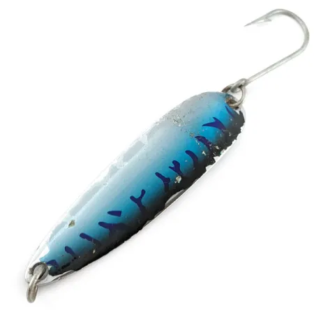 Horní stranu této plandavky Luhr Jensen Krocodile #5 zdobí vzor tmavě modrých makrelových šupin, který u okrajů přechází do světlé perleťové úpravy. S délkou 8,5 cm a výraznou hmotností 28 g je tato plandavka navržena speciálně pro dlouhé náhozy. Na zadní straně z leštěného chromu je vyraženo autentické označení „KROCODILE“ a „LUHR JENSEN“. Produkt s kódem 20377 je vybaven jedním silným jednoháčkem, což z něj činí spolehlivou volbu pro lov lososů na tazích nebo mořských dravců, u kterých je vyžadován nekompromisní zásek. Tento kus si udržuje hodnocení stavu 4/5, vykazuje mírné opotřebení, ale zachovává si sytost barev vzoru makrely i vysoký lesk kovového povrchu. Úzké, z tlustého materiálu ražené tělo umožňuje efektivně prorážet boční vítr při nahazování z mol nebo hrází.