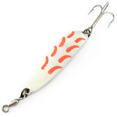 S váhou 1 oz (28 g) zůstává tato plandavka z masivního kovu jedním z nejvšestrannějších designů, jaké byly kdy vyrobeny pro nahazování i trolling. Tělo této plandavky Luhr Jensen Krocodile #5 o délce 8,5 cm (3 1/4") má na přední straně výrazný bílo-oranžový UV vzor, navržený pro lepší viditelnost v hlubší nebo přikalené vodě. Tento exemplář vyrobený v USA, identifikovaný pod kódem produktu 21107, je vybaven originálními komponenty, včetně odolného trojháčku a válečkového obratlíku zabraňujícího kroucení vlasce. Zadní strana si zachovává vysoce leštěný chromový povrch, který vytváří vysoce kontrastní odlesky proti lakované přední části. S hodnocením 5/5 vykazuje nástraha původní povrchovou úpravu i osazení ve vynikajícím stavu. Její úzký, zužující se tvar je charakteristický pro řadu Krocodile a umožňuje prezentaci v hluboké vodě i nahazování na velké vzdálenosti.