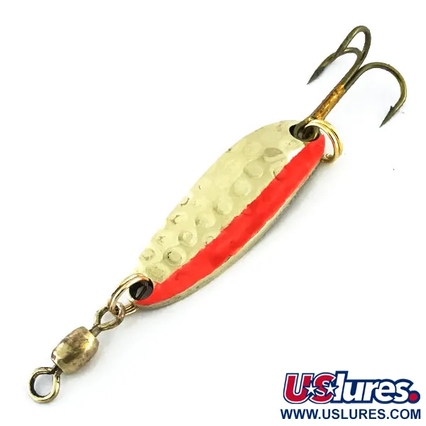 Tepaná zlatá textura dodává této 3,5 cm (1 1/2") plandavce členitý povrch, který pod hladinou efektivně odráží světlo. Tato konkrétní Luhr Jensen Krocodile s kódem 8961 váží 7 g (1/4 oz), což z ní činí univerzální volbu pro různé způsoby lovu ve sladké i lehké slané vodě. Přední strana se vyznačuje tepaným kovovým povrchem s výrazným podélným oranžovým pruhem, zatímco zadní strana nabízí hladký zlatý povrch s jasně vyraženým názvem výrobce a modelu. Krocodile je mezi zkušenými rybáři známá svým charakteristickým kolébavým pohybem; její úzký kapkovitý tvar je stvořen pro daleké náhozy a plynulé přitahování. Tento kus je ve vynikajícím stavu (hodnocení 5/5), bez známek opotřebení lakovaného pruhu nebo pokovení. Osazení je robustní, zahrnuje mosazný obratlík v hlavové části a ostrý trojháček připevněný pomocí pevného kroužku. Jedná se o ukázkový příklad řemeslného zpracování, díky kterému se značka Luhr Jensen stala na desetiletí pevnou součástí rybářských výbav.
