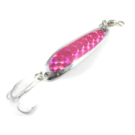 Váha 1/3 oz (10 g) dodává této 2 1/4" (5,5 cm) plandavce hustotu potřebnou k efektivnímu dosažení hlubších vodních sloupců. Niklové tělo je opatřeno výraznou fialovou a růžovou holografickou fólií, která při naklonění na světle vykazuje modrý odlesk. Luhr Jensen vyrazil název 'KROCODILE' přímo do kovu na zadní straně, což je charakteristický znak jejich klasické výroby plandavek v USA. Tento model s kódem produktu 2944 je vybaven stříbrným trojháčkem a horním obratlíkem pro navázání. V současném stavu s hodnocením 5/5 si nástraha zachovává vzhled nového výrobku, všechny součásti pevně drží a povrch zůstává jasný. Rybáři se často spoléhají na stabilní kolébavý pohyb plandavky Krocodile při lovu pstruhů a lososů v různých vodních podmínkách.