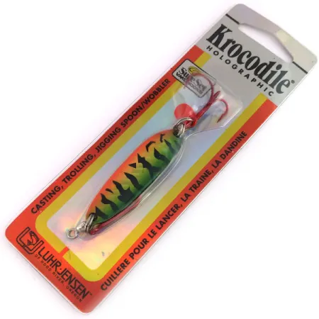 Výrazná povrchová úprava Holographic Green Tiger definuje tuto plandavku Krocodile, která se vyznačuje sytými černými svislými pruhy na zářivém zeleno-žlutém podkladu. Tato nástraha, navržená pro všestranné použití jako je přívlač, trolling a jigging, nese produktový kód 1018-038-1347. S hmotností 1/2oz (14g) a délkou 2 1/4" (5,5cm) disponuje úzkým, silným raženým tělem, které napomáhá dalekým náhozům. Originální balení zdůrazňuje odkaz značky Luhr Jensen z Hood River v Oregonu a zmiňuje efekt X-Treme Holographic Flash. Plandavka je osazena trojháčkem Sure Set VMC a v blistru obsahuje navíc jednoháček Siwash, což ocení sběratelé i praktičtí rybáři s ohledem na různé rybářské řády. Kovový povrch je zkonstruován tak, aby odrážel světlo i za snížené viditelnosti. Tento exemplář je nepoužitý, stále zapečetěný v původním maloobchodním balení a udržuje si stav 5/5.