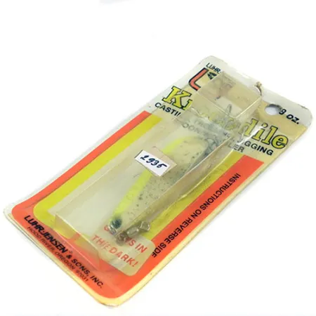 Světelné vlastnosti jsou hlavním rysem této plandavky o hmotnosti 1/2 oz (14g), která je navržena tak, aby zůstala viditelná v hlubší a tmavší vodě. Tato Luhr Jensen Krocodile Die #3 Glow (kód produktu 2935) o délce 2 1/4" (5,5 cm) má povrchovou úpravu označenou na zadní straně obalu jako „GLO/CHART. STRIP“, která kombinuje bílé a žluté akcenty na niklovém základě. Nástraha vyrobená v Hood River v Oregonu je konstruována pro všestranné použití při přívlači, trollingu i jiggingu. Tento exemplář má hodnocení stavu 6, což znamená, že je nepoužitý a zachovaný v původním vintage blistru. Obal obsahuje technické pokyny pro vázání vylepšeného uzlu clinch a popisuje záměr dosáhnout ryb v hloubce tím, že se nástraha nechá klesnout před zahájením navíjení. Těžká konstrukce kovového těla je specificky vyvážena pro podporu dalekých náhozů i ve větrných podmínkách.