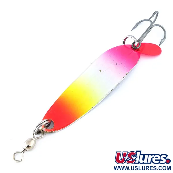 Tato kovová plandavka o délce 5,5 cm (2 1/4") a hmotnosti 10 g (1/3 oz) je navržena pro přesné nahazování do vzdálených lovišť. Luhr Jensen Krocodile se vyznačuje úzkým profilem a silným materiálem, díky čemuž proráží vítr lépe než širší a tenčí alternativy. Tento konkrétní kus s kódem produktu 10711 se pyšní výrazným barevným přechodem od růžové u háčku přes bílou a žlutou až po červeno-oranžovou špičku. Výrazným prvkem jsou UV reaktivní vlastnosti; při slabém osvětlení střed těla silně zeleně světélkuje, zatímco konce získávají temně karmínový odstín. Výbava zahrnuje přední obratlík pro ochranu vlasce a ostrý trojháček zdobený červeným plastovým lákadlem. Nástraha je ve stavu 5/5 a vykazuje originální tovární lesk na reflexních površích. Ať už při trollingu nebo přívlači, rozložení hmotnosti zajišťuje stabilní kolísavý pohyb, který je vysoce účinný pro lov lososů a pstruhů.