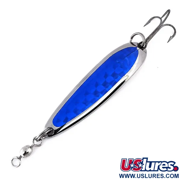 Horní stranu této 19g (2/3oz) plandavky pokrývá výrazná modrá holografická prismatická páska, která vytváří ostrý kontrast k leštěnému niklovému povrchu na rubu. Tento exemplář, vyrobený společností Luhr Jensen v USA, je Krocodile Die #4, vedený pod kódem 10296. Tělo o délce 6,5 cm (2 1/2") je opatřeno klasickou ražbou „KROCODILE“ Die #4 s uvedením sídla výrobce v Hood River v Oregonu. Výbava zahrnuje továrně instalovaný obratlík v přední části a robustní trojháček zajištěný pevným kroužkem. Tato specifická barevná kombinace Nikl / Modrá je často vyhledávána rybáři při lovu lososů nebo pstruhů v čistých vodách, kde je vyžadována vyšší hmotnost pro dosažení hloubky. Povrchy i háček jsou ve vynikajícím stavu (5/5) s čistým, reflexním leskem kovu i pásky. Každá ražba je ostrá a hluboká, což odráží vysoké standardy historické produkce Luhr Jensen.