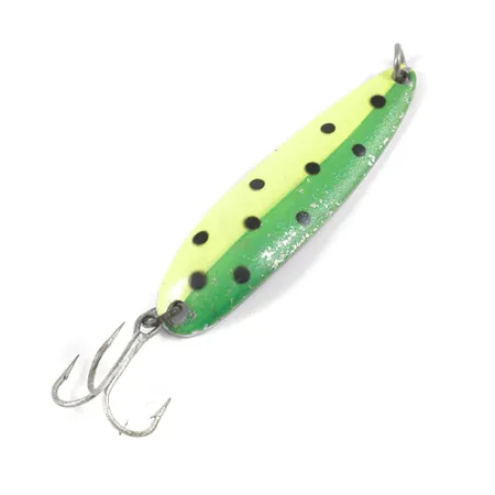 Tato klasická plandavka Luhr Jensen o hmotnosti 1/2 oz (14 g) se vyznačuje zářivým dvoubarevným nátěrem na své konvexní straně. Polovina povrchu je jasně žlutá, zatímco druhá polovina přechází do sytě zelené, přičemž obě jsou zdobeny řadou výrazných černých teček. Krocodile Die #4 o délce 2 1/2" (6,5 cm) je všestranný nástroj pro rybáře, kteří potřebují dosáhnout hlubších vodních sloupců, kde loví dravé ryby jako lososi nebo siveni obrovští. Otočením nástrahy se odhalí leštěný niklový povrch s vyraženými údaji výrobce a specifickým označením Die #4, což svědčí o jejím americkém původu. Tento konkrétní exemplář s produktovým kódem 1983 má hodnocení stavu 4/5, vypadá čistě a vykazuje minimální známky používání. Konstrukce ze silného kovu je doplněna spolehlivým trojháčkem a robustními kroužky.