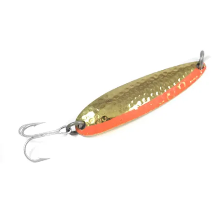 Textury tepaného zlata zachycují světlo na konvexní straně této klasické plandavky, speciálně navržené pro rybáře, kteří vyžadují daleké hody a hloubku. Tato Luhr Jensen Krocodile Die #4 o hmotnosti 17 g (3/5 oz) a délce 6,5 cm (2 1/2") má silný, úzký profil vhodný pro nahazování i trolling. Podél jedné hrany tepaného povrchu se táhne zářivě oranžový pruh, který vytváří ostrý vizuální kontrast k reflexnímu kovovému tělu. Na hladké vnitřní straně je jasně vyraženo ikonické jméno 'KROCODILE' spolu se značkou Luhr Jensen a jejich původem z Hood River v Oregonu, což je detail, který sběratelé oceňují pro ověření autenticity. Tento exemplář s produktovým kódem 2085 zůstává ve stavu 5/5, je vybaven čistým trojháčkem a robustními kroužky. Rozložení hmotnosti modelu Die #4 mu umožňuje udržet si pozici ve vodním sloupci i při navíjení v rychlejším proudu.