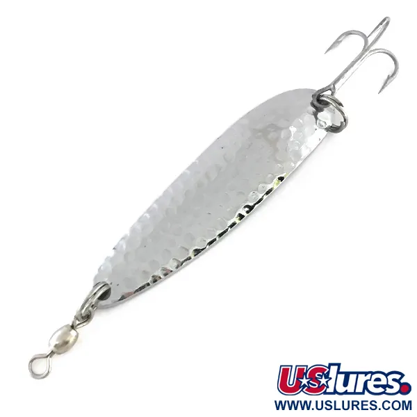 Povrchová úprava z tepaného niklu dodává plandavce Krocodile Die #4 víceúčelový povrch navržený tak, aby odrážel světlo z různých úhlů. Tato plandavka Luhr Jensen s produktovým kódem 8426 váží 19g (2/3oz) a měří 6,5cm (2 1/2"). Na zadní straně nástrahy je vyražen název výrobce, název modelu „KROCODILE“ a označení původu „Hood River, Ore. Made in USA“. Její úzký, zatížený profil je určen pro daleké hody při lovu v hlubších zónách a při navíjení nebo trollingu vykazuje charakteristický kolísavý pohyb. Výbava se skládá z robustního trojháčku a obratlíku připevněného pomocí kroužků. Tento konkrétní kus je ve stavu 5/5, zachovává si jasný kovový lesk na obou stranách s čistými originálními komponenty.