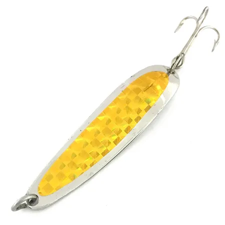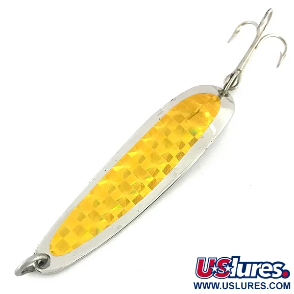 Třpytka Krocodile Die #4 o délce 6,5 cm (2 1/2 palce) je opatřena výraznou zlatou prismatickou páskou na leštěném niklovém povrchu. Tato 14g (1/2 oz) plandavka od Luhr Jensen s produktovým kódem 8533 odráží klasické řemeslné zpracování z Hood River v Oregonu. Úzké tělo s tlustým profilem je charakteristickým znakem designu Krocodile, určeným pro dosažení velkých vzdáleností při nahazování nebo udržení hloubky při trollingu. Na zadní straně je do kovu jasně vyražen název výrobce a místo původu, což zdůrazňuje čisté linie niklového základu. Osazení tvoří pevný kroužek a ostrý trojháček, což dokládá originální tovární integritu. Tento exemplář s hodnocením 5/5 je ve vynikajícím stavu, zachovává si vysokou odrazivost i ostrou geometrii holografického vzoru. Kombinace stříbrného zadního dílu a zlatého předního dílu nabízí všestranný barevný profil pro rybáře cílící na dravé druhy.