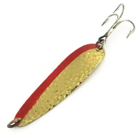 Tepané zlacení s výrazným červeným akcentním pruhem definuje vizuální profil tohoto klasického modelu Die #4. S hmotností 1/2 oz (14 g) a délkou 2 1/2" (6,5 cm) je konstrukce ze silného kovu navržena pro daleké náhozy a dosažení hlubších zón. Na zadní straně se nachází autentická ražba, která jasně uvádí původ od Luhr Jensen z Hood River v Oregonu v USA. Tento konkrétní exemplář nese kód produktu 9137 a zůstává ve vynikajícím stavu s hodnocením 5/5, což dokládá zachovalost původní tovární povrchové úpravy. Odolné kroužky zajišťují ostrý trojháček, připravený k nasazení ve sladkovodním i mořském prostředí. Úzký profil a značná hmotnost designu Krocodile umožňují snadné prorážení větru při dlouhých náhozech. Červený pruh vytváří kontrast pro vyvolání záběru proti strukturovanému zlatu, které je navrženo tak, aby napodobovalo šupiny nástražních rybek.