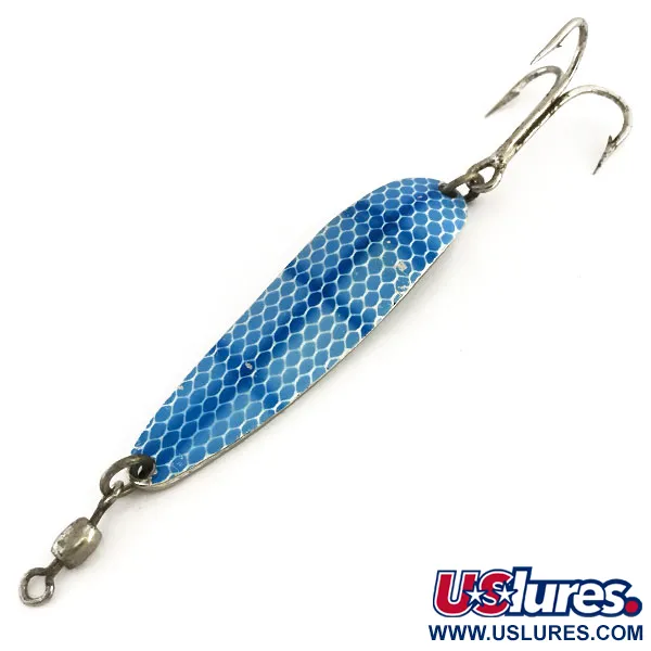 Výrazný modrý voštinový vzor šupin zdobí přední stranu této plandavky Luhr Jensen Krocodile Die #4, což je klasický design z jejich americké produkce. S váhou 21g (3/4oz) a délkou 6,5cm (2 1/2") je tato odhazovací plandavka konstruována pro daleké hody a hloubku, často vyhledávaná rybáři při lovu táhnoucích lososů na Velkých jezerech. Zadní strana má povrchovou úpravu z leštěného niklu s vyraženou značkou Luhr Jensen. Nástraha, označená produktovým kódem 9138, vykazuje díky svému silnému a úzkému profilu charakteristický kolébavý pohyb. Je vybavena robustním válečkovým obratlíkem v přední části a ostrým trojháčkem na konci. Povrchová úprava modrého vzoru i niklové zadní strany je mimořádně zachovalá, což odpovídá hodnocení stavu 5/5. Ať už nahazujete z mola nebo trollujete, těžké rozložení hmotnosti umožňuje stabilní prezentaci v hluboké vodě.