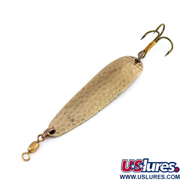 Tepané zlaté povrchy této plandavky Luhr Jensen Krocodile Die #4 slouží specifickému účelu: zachycují a lámou světlo, čímž vytvářejí vysokou viditelnost v různých vodních podmínkách. Tato 14g (1/2 oz) plandavka je vyrobena s tlustším a užším profilem než standardní modely, což je konstrukční volba určená k dosažení značných vzdáleností při nahazování z mol nebo hrází do hluboké vody. Jedna strana 6,5 cm (2 1/2 palce) těla je hluboce tepaná, zatímco druhá zůstává hladká a nese jasné razítko Luhr Jensen Krocodile a označení hmotnosti. Při hodnocení stavu 5/5 vykazuje pokovení jasný, konzistentní lesk a zůstává velmi čisté. Součástí výbavy je robustní mosazný obratlík u hlavy a ostrý trojhák na ocasu. Tento model, známý svým stabilním kolébavým pohybem při středním tempu navíjení, je již dlouho základem pro lov lososů ve Velkých jezerech. Kód produktu 9947 je spojen s touto konkrétní 14g (1/2 oz) konfigurací, která obsahuje z výroby instalovaný vysoce pevný kroužek pro háček.