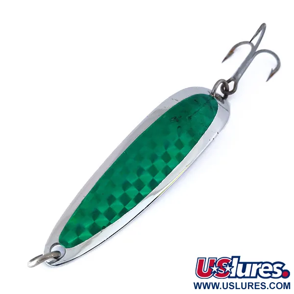 Tato specifická plandavka o hmotnosti 21 g (3/4 oz) je vybavena zářivě zelenou prismatickou fólií se šachovnicovým vzorem na přední straně. Tato Luhr Jensen Krocodile Die #5 s produktovým kódem 10472 měří na délku 8,5 cm (3 1/4") a představuje klasický design s úzkým pasem z éry výroby značky v Hood River v Oregonu. Zadní strana plandavky je z leštěného niklu a nese hlubokou, ostrou ražbu s detaily značky a původem z Oregonu. Výbava zahrnuje jeden silný trojháček připevněný pomocí kroužku v zadní části a odpovídající kroužek v přední části pro připojení vlasce. Ve stavu 5/5 vykazují niklové povrchy jasný, čistý lesk a reflexní fólie pevně drží bez odlepování okrajů. Tato hmotnost a profil jsou obvykle využívány rybáři, kteří chtějí prochytávat hlubší vodní sloupce nebo dosáhnout větší vzdálenosti při nahazování proti větru. Velikost Die #5 z ní dělá skvělou volbu pro lov velkých pstruhů, lososů nebo různých mořských druhů.