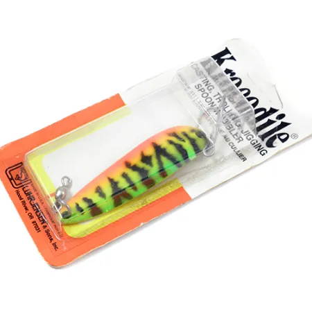 Tato robustní plandavka o délce 8,5 cm (3 1/4") je základem pro rybáře, kteří potřebují zasáhnout dravce v hlubokých vodách. Výrazné černé tygří pruhy na neonově zeleném a oranžovém gradientu definují vzor Fire Tiger na této Krocodile Die #5, což je povrchová úprava určená pro viditelnost v kalných vodách. Tento exemplář s produktovým kódem 1978 je nepoužitý a zůstává v původním balení Luhr Jensen & Sons z Hood River v Oregonu. Konstrukce ze silného kovu je stavěna pro všestrannost, přičemž tovární karta výslovně zdůrazňuje její použití pro přívlač, trolling a jigging. Při hmotnosti 21 g (3/4 oz) nabízí nástraha hustotu potřebnou pro daleké hody v silném větru nebo pro dosažení hloubky v proudu. Výbava zahrnuje obratlík v přední části pro zamezení kroucení vlasce a silný kroužek v ocasní části. Zadní strana obalu obsahuje původní inventární štítek potvrzující specifikace barvy a velikosti. Průhledný blistr uchoval barvu sytou a kovové povrchy lesklé.
