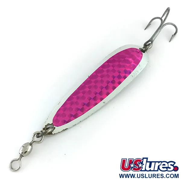 Tato robustní kovová plandavka o délce 3 1/4 palce (8,5 cm) je vybavena výraznou růžovou prismatickou páskou na reflexním chromovém těle. Tento Luhr Jensen Krocodile Die #5, označený kódem 8508, váží 1 oz (25 g), což je hmotnostní kategorie navržená speciálně pro lov v hloubkách nebo pro daleké nahazování z mol a hrází. Na zadní straně plandavky jsou jasně vyraženy historické značky „KROCODILE“ a „LUHR JENSEN“ spolu s americkým původem. Horní obratlík i zadní trojháček jsou upevněny pomocí pevných kroužků, které zajišťují integritu potřebnou pro zdolávání větších druhů lososovitých ryb. Prismatický vzor na tomto exempláři poskytuje mnohasměrné odlesky světla, které kontrastují s leštěným kovem po obvodu. Tato nástraha zůstává ve vynikajícím stavu s hodnocením 5/5. Ražba na zadní straně je hluboká a čitelná, což je detail, který sběratelé u těchto klasických plandavek oceňují.