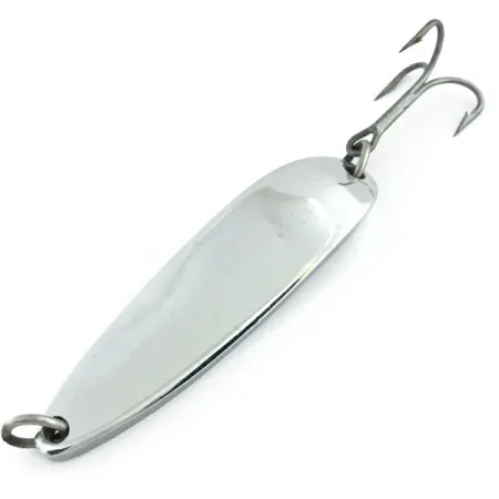 Leštěný niklový povrch odráží světlo po celém 8,5 cm dlouhém těle této těžké plandavky. S výraznou hmotností 64 g je Krocodile Die #5 zkonstruována pro dosažení hloubek nebo překonání silných proudů, kde lehčí nástrahy často selhávají. Vyražené značky na konkávní straně jasně označují původ v Hood River v Oregonu, což je charakteristický znak klasické éry produkce značky Luhr Jensen. Tento konkrétní exemplář, identifikovaný kódem produktu 9291, nese označení Die #5, což značí silnější a těžší profil ve srovnání se standardními plandavkami podobné délky. Osazení zahrnuje robustní trojháček zajištěný zesíleným kroužkem, doplněný podobným kroužkem u očka pro navázání vlasce pro maximální pevnost proti velkým sladkovodním i mořským predátorům. Stav je hodnocen 5/5, vykazuje zrcadlový povrch a ostré, dobře čitelné tovární ražby. Celokovové tělo a úzký, protáhlý tvar jsou speciálně navrženy pro daleké hody, což z ní činí nepostradatelnou nástrahu pro lov z mol nebo v příboji, kde je rozhodující dosah na velkou vzdálenost.