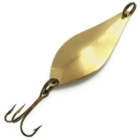 Pozlacení pokrývá štíhlé, listovité tělo této třpytky Lane’s Flasher, která je kouskem rybářské historie z Wyomingu ve státě New York. Odborně vyražené značky „LANE’S FLASHER“ a „WYOMING, N.Y.“ odrážejí dědictví společnosti Lanes Tackle & Bait, která svou cestu zahájila v roce 1935. S hmotností 1/2 unce (14 g) je tento exemplář masivní plandaavkou určenou pro nahazování nebo trolling. Předmět s produktovým kódem 5716 je ve stavu 5/5 a vykazuje jasný a dobře zachovalý povrch, který přežil z let provozu společnosti před jejím uzavřením na začátku 80. let. Její 7cm (2 3/4") tělo je osazeno jedním trojháčkem připevněným pomocí robustního kroužku v zadní části, zatímco přední očko zůstává připraveno k navázání vlasce. Kapkovitý tvar přechází z úzké hlavy do širšího břicha a zachycuje podstatu jednoduchého, ale účinného designu nástrah z poloviny 20. století.