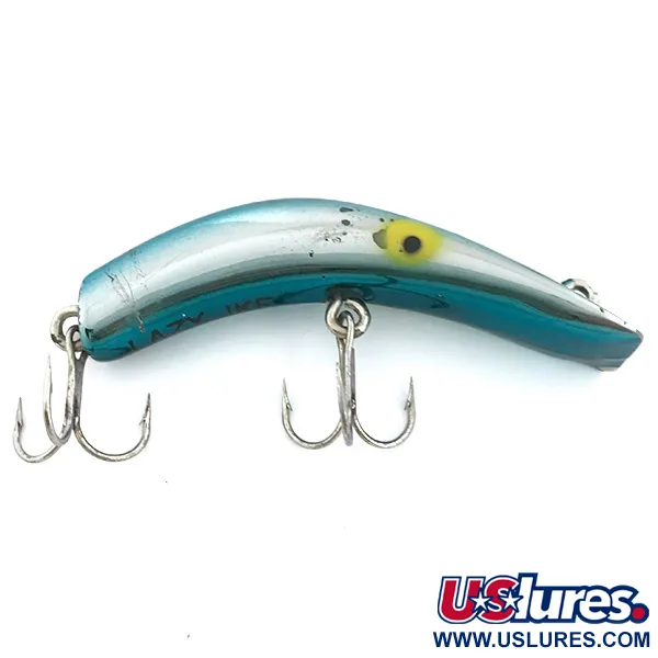 Tento 14g (1/2 oz) exemplář v atraktivním provedení Light Blue Metallic přes Mirror Silver se vyznačuje klasickým banánovitým profilem, který se stal legendou v krabičkách rybářů po celých USA. Wobler o délce 8,5 cm (3 1/4") nese na břiše jasně vyražené jméno „LAZY IKE“, které sběratelé často hledají jako potvrzení autenticity. Tento model pod kódem 6739 je plovoucí verzí určenou pro lov v mělkých vodách v hloubkách 0,3 – 0,6 m (1-2 ft). Povrchová úprava je výjimečně zachovalá (stav 5/5), přičemž zrcadlově stříbrné břicho zajišťuje výrazné odlesky. Je osazen dvěma sadami ostrých trojháčků na pevných kroužcích. Žlutě malované oči s výraznými černými zornicemi jsou umístěny v přední části a dodávají kovovému tělu charakter. Návnada určená pro přívlač i trolling při lovu candátů nebo štik odráží odolnost typickou pro americké náčiní poloviny minulého století. Hřbet přechází do světle modrého odstínu, který čistě kontrastuje se stříbrnými boky.