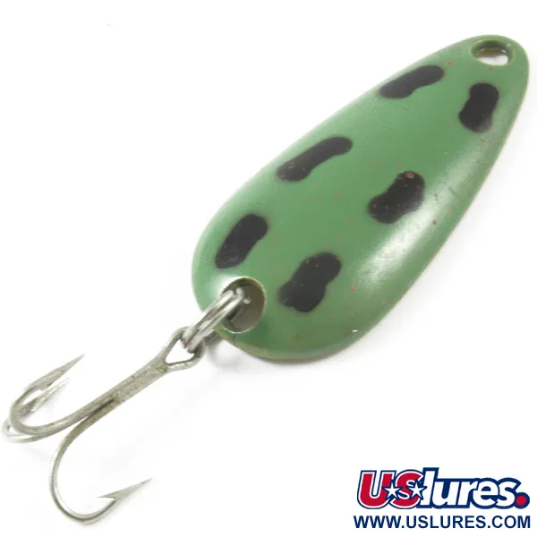Na mosazné spodní straně je jasně vyražena značka „LEN THOMPSON No. 00“, která identifikuje tuto kanadskou klasiku. Horní strana má matně lesní zelený základ zdobený sedmi výraznými černými tečkami, což je vzor často používaný k napodobení obojživelníků nebo nástražních rybek. Třpytka o délce 5 cm (2") a hmotnosti 14 g (1/2 oz) je vyrobena z masivní mosazi, což je materiál, který výrobce používá již od roku 1929 k zajištění specifického vyvážení. Toto rozložení hmotnosti umožňuje pomalý kolébavý pohyb při přitahování. Výbava se skládá z jednoho trojháčku připevněného kroužkem na ocase, zatímco otvor pro návazec je umístěn na zúžené špičce. Exemplář katalogizovaný pod kódem produktu 3217 je ve stavu 4/5, vykazuje dobře zachovalý lak na horní straně a jasný, čistý mosazný povrch na rubu. Přívlač nebo trolling s touto plandavkou je tradiční metodou pro lov štik, lososů a jezerních pstruhů.