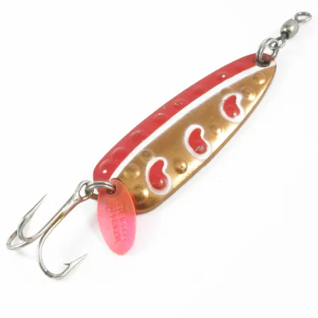 Měděné pokovení s vyraženými důlky na zadní straně podtrhuje tradiční řemeslné zpracování kanadské výroby nástrah. Tato nástraha Len Thompson #13 váží 25g (1oz) a měří 7cm (2 3/4"). Má výrazný červenobílý vzor kapky na leštěném měděném těle. Tento konkrétní kus s produktovým kódem 3287 je ve stavu 5/5, vykazuje jasný lesk a zachovalý lak. Výbava zahrnuje robustní trojháček doplněný průsvitným růžovým dráždidlem a vysoce odolný obratlík na předním kroužku. Na vnitřní konkávní straně je do kovu uprostřed texturovaného povrchu jasně vyražena značka výrobce. Tato plandavka je navržena pro všestrannost a často se používá pro přívlač nebo trolling při lovu štik, lososů a jezerních pstruhů.